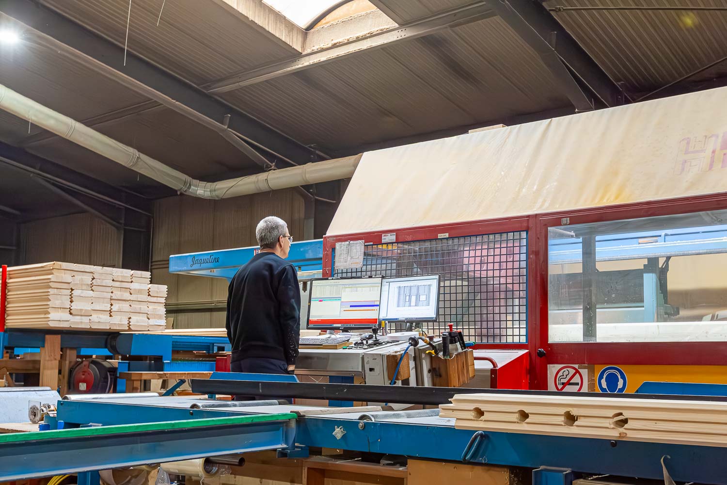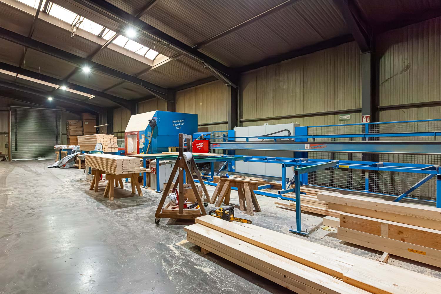 Unsere Produktion ist mit drei der modernsten Abbundanlagen der Firma Hundegger ausgestattet – darunter zwei leistungsstarke „K2i“. Diese Technik ermöglicht uns einen außergewöhnlich hohen Vorfertigungsgrad, der nicht nur die Bauzeit deutlich reduziert, sondern auch komplexe Dachkonstruktionen mit großen Querschnitten in höchster Präzision realisierbar macht.